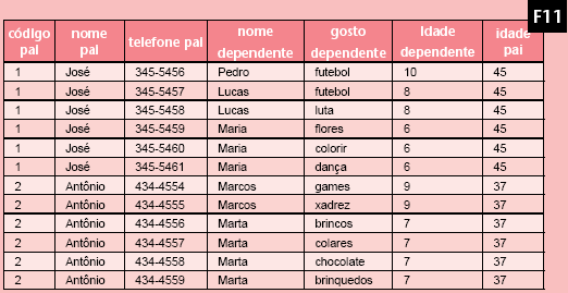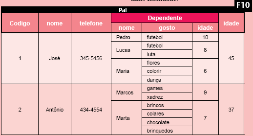 2) Criar uma tabela auxiliar para conter o atributo multivalorado – essa opção é adotada por alguns autores pela praticidade. No entanto, em alguns casos essa abordagem pode induzir a erros. Por exemplo, observe o aninhamento de três tabelas na figura 10 (vários gostos dentro de dependentes e vários dependentes dentro de pai).