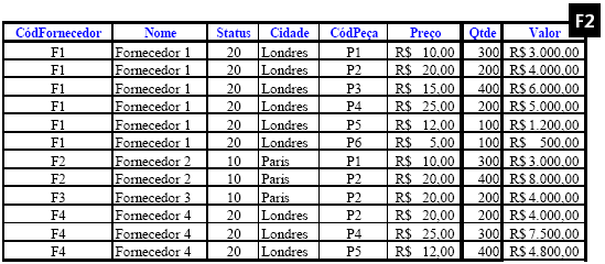 Anomalias no comando UPDATE - O valor do campo Cidade aparece repetido várias vezes na tabela. Essa redundância aumenta a probabilidade de erros durante uma atualização. Por exemplo, se o fornecedor F1 se mudar de Londres para Amsterdã, teremos que pesquisar todos os registros correspondentes e atualizá-los, tomando o cuidado de não deixar os dados inconsistentes (uma ocorrência de F1 pode receber Amsterdã e outra Londres). Observe que o mesmo problema se aplica aos campos Nome, Status e Preço.
