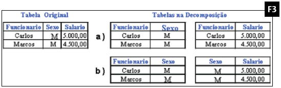 O processo de normalização envolve a quebra ou decomposição de uma tabela em partes menores. Essa decomposição tem que ser reversível, de modo que nenhuma informação seja perdida no processo. O fato de uma decomposição ser ou não sem perdas está intimamente ligado ao conceito de dependência funcional visto anteriormente. Veja as considerações abaixo, com base na figura 3: