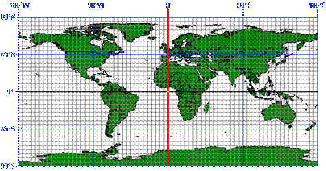 Na Figura 1, é possível visualizar diversas linhas verticais e horizontais cinzas, mas o que nos interessa são as linhas vermelha e preta centrais. A linha vermelha é a linha imaginária que representa a Longitude. Ela e suas paralelas são verticais e seguem ao meridiano de Greenwich (que está representado em vermelho), que por sua vez separa a Terra em hemisfério oriental (leste) e hemisfério ocidental (oeste). Os pontos de Longitudes chegam a no máximo 180 graus para cada lado, que somando ambos os hemisférios completam os 360 graus do globo.