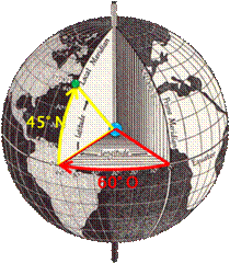 Para a geração de um ponto, são necessários três passos. Primeiro é traçado uma linha do centro da Terra até o ponto Zero-Zero, que é o cruzamento entre o Meridiano de Greenwich e a Linha do Equador. O segundo passo é levar a linha de Longitude até o ponto em Leste (direita) ou Oeste (esquerda). O terceiro passo é encontrar o ponto na Latitude, elevando a localização para Norte (cima) ou para Sul (baixo) da linha do equador. Estes pontos que foram criados geram graus de abertura de um raio para Longitude e Latitude, e eles que darão origem ao ponto localizado. No exemplo da Figura 2, foi aberto 60° pra Oeste e 45° para Norte, chegando até Sydney. O ponto azul no centro do globo indica o centro da Terra, a vértice vermelha indica a Longitude aberta com 60°, a vértice amarela indica a Latitude aberta com 45° e por final o ponto verde indica o Ponto Geográfico de Latitude e Longitude, representado por 60ºO e 45ºN.