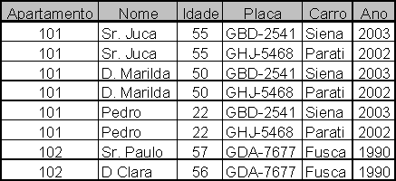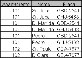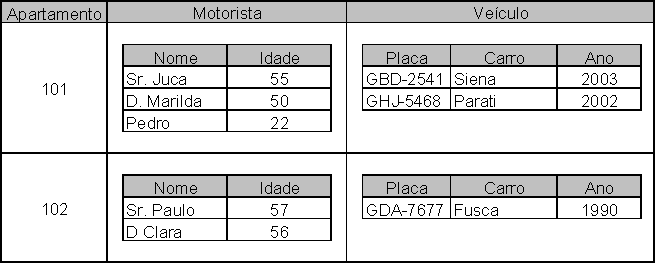 Por exemplo, imagine um condomínio que deseja cadastrar os veículos e os motoristas que os dirigem (para cada apartamento). Considere que qualquer motorista do apartamento pode dirigir qualquer carro daquela moradia (isso cria uma independência entre veículos e motoristas). Um exemplo de dados seria o mostrado na Figura 6.
