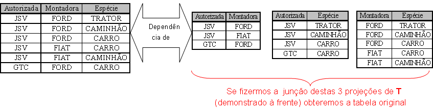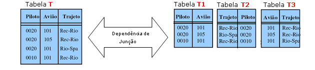 3) Dizemos que há uma dependência de junção se todas as linhas em T puderem ser formadas a partir da junção dessas três projeções simultaneamente. Ou seja, se a tabela T original puder ser decomposta em 3 tabelas menores T1, T2 e T3 (3-decomponível), as quais sejam originadas de suas projeções, teremos na tabela T o que chamamos dependência de junção.