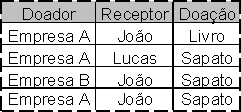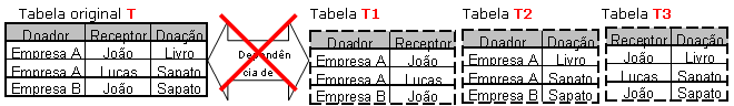 Para facilitar ainda mais o entendimento, vejamos outro exemplo em que não teremos a dependência de junção. Suponha que nós tenhamos empresas que façam doações de alguns objetos para algumas pessoas, como na tabela original T da Figura 14.