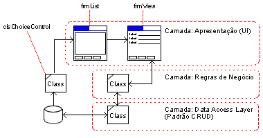 Para o formulário frmList (formulário destinado a listar grande quantidade de opções) é implementada uma classe de apoio contendo mecanismos que por polimorfismo carregam objetos que são instâncias de sub-classes de ChoiceControl, tais como ComboBox e ListBox.