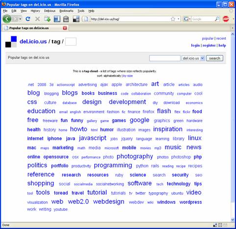 Tag’s são como rótulos para um determinado assunto. Um assunto pode ter mais de uma tag associada a ele. Por exemplo: se estamos postando uma informação sobre o Campeonato Brasileiro, podemos adotar como tag as palavras: futebol, esporte, campeonato, bola, campo, estádio, jogador, etc. Enfim, tudo que venha a lembrar o tema Campeonato Brasileiro. Um bom exemplo de site que utiliza o recurso de tags é o http://del.icio.us. Eles chamam de tag cloud, ou Nuvem de Tags, Figura 1. Além das tag’s podemos fazer a pesquisa no Titulo e no Texto da postagem.