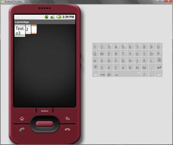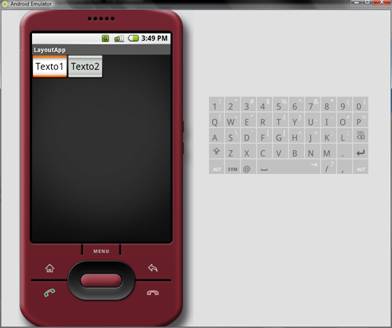 O tamanho total de um FrameLayout é definido pelo seu maior filho mais o espaçamento (padding) e todos os componentes são agrupados no canto superior esquerdo do layout. Porém, a sua utilização comumente dá-se a partir de suas subclasses, como ImageSwitcher, ViewAnimator, ViewSwitcher, ScrollView, TabHost, etc (para maiores detalhes confira a referência desta classe em http://code.google.com/android/reference/android/widget/FrameLayout.html). A Listagem 2 mostra como este layout é implementado em XML e a Figura 9, exibe como ele é visualizado na tela do emulador.