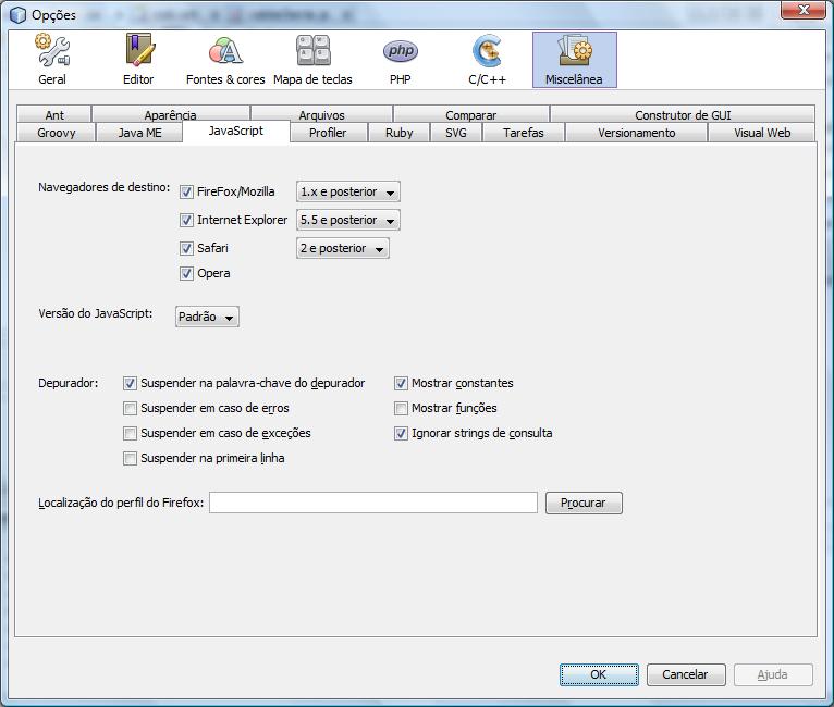 A versão 6.5 do NetBeans suporta depuração de JavaScript nos browsers FireFox, Internet Explorer, Opera e Safari. Para assegurar que o processo de depuração apresentado neste artigo funcione, siga o passo a passo do Quadro de instalação e configuração do ambiente.