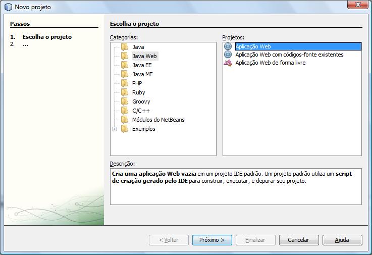 2. Clique na opção Categorias – Java Web e Projetos – Aplicação Web, conforme o modelo da Figura 2;