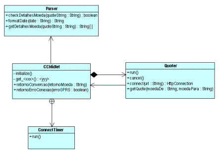 Veja na Figura 2 o diagrama de classes da aplicação. CCMidlet é a MIDlet da aplicação, e como veremos adiante, os métodos initialize e get_
