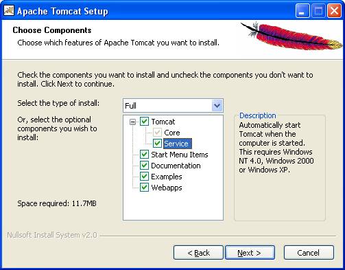 A instalação do Tomcat 5 sempre cria um serviço do Windows (NT/2000/XP/2003) para o Tomcat. Entretanto, na opção Normal o serviço é instalado com ativação manual. Se você preferir que o serviço do Tomcat seja ativado automaticamente sempre que o Windows for iniciado, basta expandir o componente "Tomcat" e selecionar o componente "Service". Ainda assim, o tipo de inicialização do serviço do Tomcat pode ser facilmente alterado entre Manual ou Automático a qualquer momento após a instalação. Isso pode ser feito de diferentes formas.