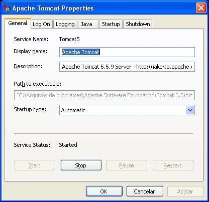 Primeiro, dê um clique com o botão direito no ícone de execução do Tomcat e selecione a opção Configure.... Será apresentada a janela da Figura 3. Perceba que o campo Startup Type está configurado para Automatic em decorrência da opção definida durante a instalação. Podemos alterar este campo para Manual ou Disabled. Ainda nesta tela, é possível também interromper, inicializar, pausar e reiniciar o serviço Tomcat.