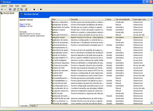 Segundo, acesse a ferramenta de administração de serviços do Windows seguindo o caminho: Iniciar | Painel de Controle | Ferramentas Administrativas | Serviços. Lá encontraremos o serviço do Tomcat e também poderemos interrompê-lo, inicia-lo e reinicia-lo (ver Figura 4).