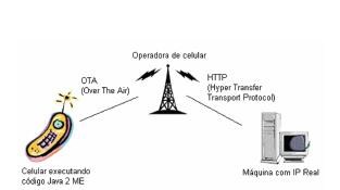 Também é possível conectar a outros dispositivos que possuem identificação única na rede, por exemplo, outros aparelhos celulares. A Figura 1 exemplifica o processo de comunicação celular/servidor via protocolo http, onde o aplicativo instalado no celular (midlet) se comunica com uma aplicação web feita em Java (servlet).