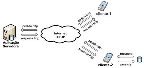 Na Figura 1, quando a aplicação cliente-1 precisa se comunicar com a aplicação servidora, esta envia um pedido pela Internet. Este pedido é interpretado pela aplicação servidora e uma resposta é gerada e enviada de volta. A comunicação entre as aplicações cliente-2 e servidora ocorre da mesma forma, mas, antes de cliente-2 enviar um pedido, esta verifica se já não possui localmente os dados necessários. Caso esses dados sejam encontrados, são recuperados do próprio dispositivo, sem qualquer comunicação entre as aplicações.