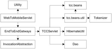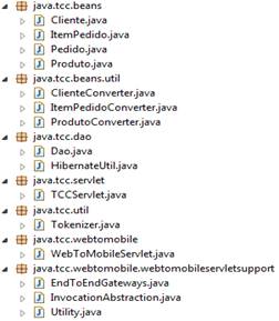 No pacote tcc.servlet está a classe TCCServlet, um servlet que possui a implementação de métodos que fazem chamadas aos métodos de carregamento e persistência de dados da classe Dao, além da conversão de objetos para stream (seqüência de caracteres). Já no pacote tcc.webtomobile está a classe WebToMobileServlet, o servlet criado pelo NetBeans Mobility Pack e que usa o método POST do protocolo HTTP para transferir dados entre as aplicações cliente e servidora. A criação deste servlet pelo NetBeans Mobility Pack propicia uma grande facilidade, pois automatiza a criação da conexão fim-a-fim entre a aplicação Java ME e a servidora, já que ele é o real responsável pelo recebimento das requisições das aplicações cliente. Por fim, em tcc.webtomobile.webtomobilesupport foram criadas algumas classes utilizadas por WebToMobileServlet e ainda outras classes utilizadas na leitura e escrita dos objetos enviados para atender as requisições recebidas.