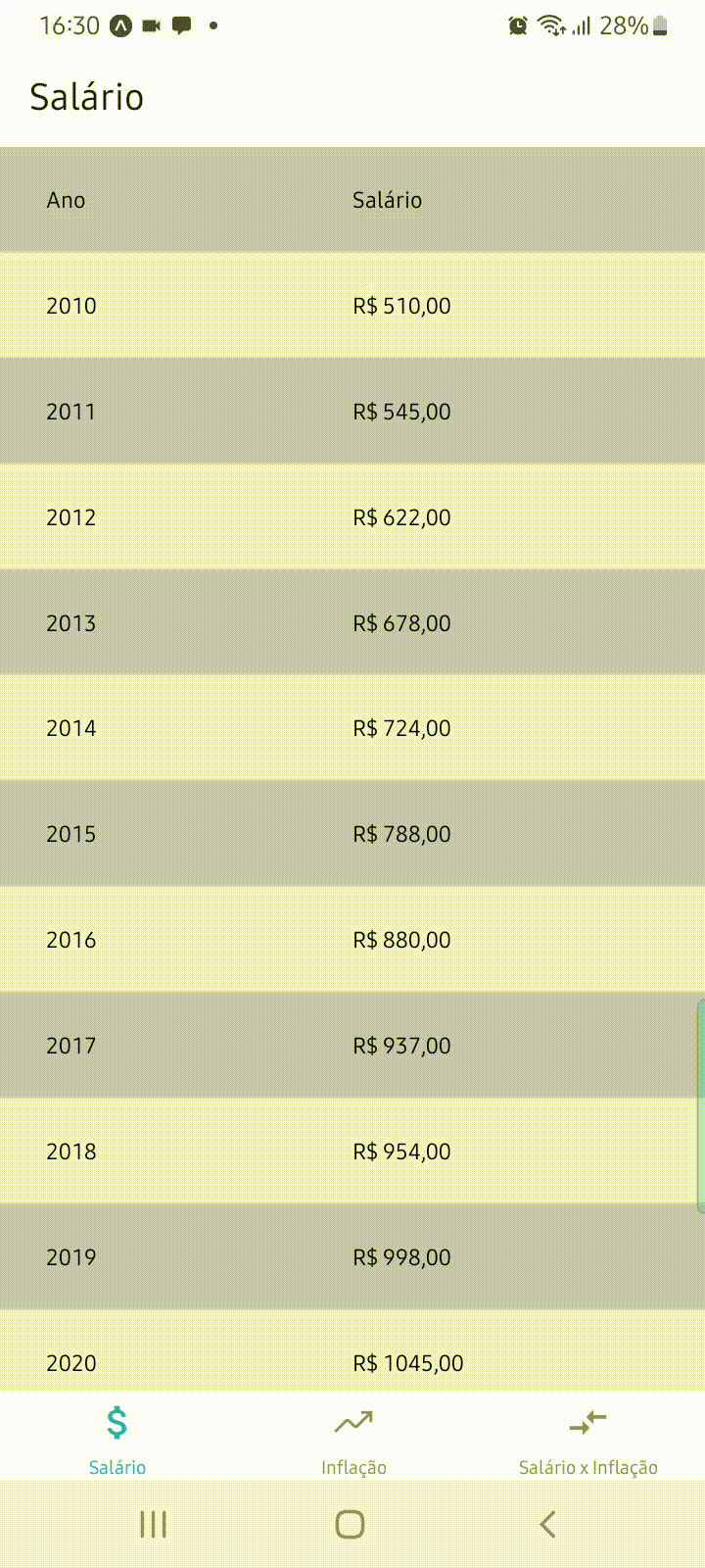 A proposta desse projeto é criar um aplicativo mobile que lista informações de salário e inflação dos anos de 2010 até 2020 utilizando o recurso de props para transferir dados entre componentes.