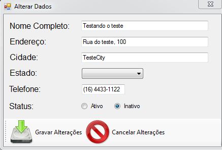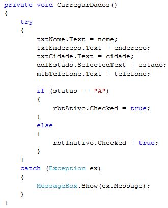 Para não perdemos tempo, exibo abaixo as imagens dos métodos importantes desse form, o AlterarDados e CarregarDados (que é chamado no evento Load do form), o primeiro responsável por realizar o UPDATE no banco (método praticamente igual ao de gravar clientes) e o segundo responsável por exibir os valores preenchidos nos controles, como você viu na imagem acima: