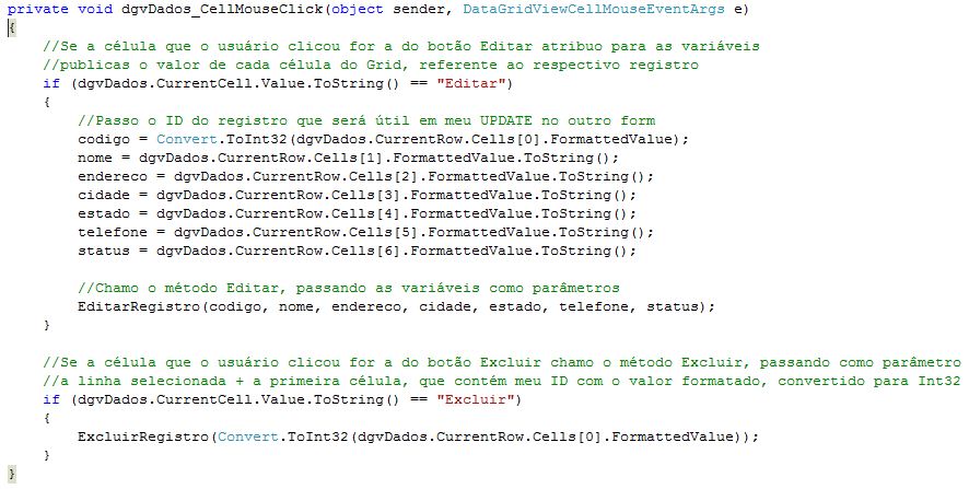 Agora clique no GridView, aperte F4, vá a janela de eventos do grid e dê dois cliques no evento CellMouseClick, que captura o clique do mouse do usuário no grid. Nele, insira o seguinte código para já capturarmos se o usuário clicou em Editar ou Excluir: