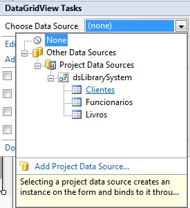 Para terminar nosso artigo, ficou faltando os forms de Alteração/Exclusão. Então vamos a eles. Abra o frmAlterarExcluirClientes. Farei uma correção, no final da parte 2 do artigo, disse-lhes para adicionar as colunas referentes aos campos do Grid, mais não precisaremos fazer isso. Dito isto, clique na SmartTag, clique em Edit Columns, remova as colunas referentes aos campos da tabela Clientes e só deixe os botões Editar e Excluir. Clique em OK, volte a SmartTag, clique em Choose Data Source, para escolher a fonte de dados do GridView, clique em Other Data Sources > Project Data Sources > dsLibrarySystem > Clientes, como a imagem abaixo ilustra: