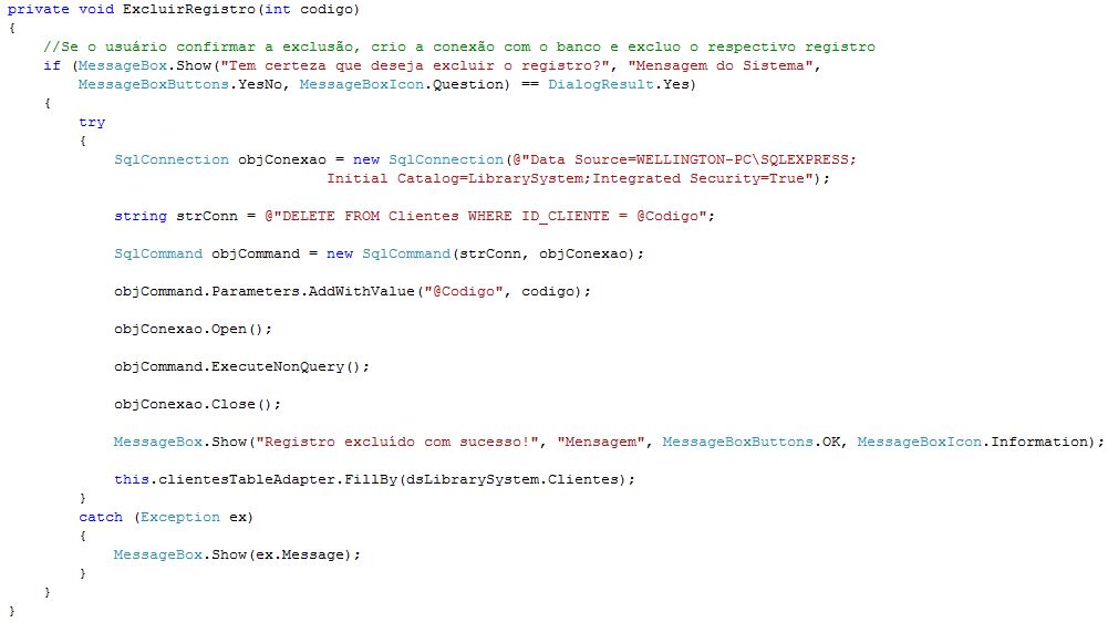 Ainda temos em nossa página os métodos CancelarAlteracoes e o LimparCampos, que são iguais aos métodos do frmCadastrarClientes. Agora é só replicar estes códigos nos forms de Livros e Funcionários.