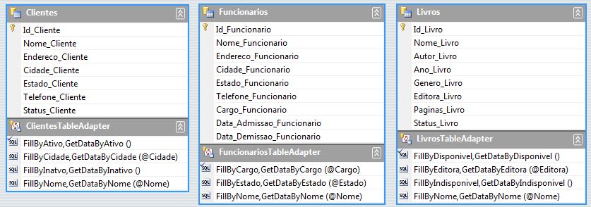 Com o DataSet aberto, vá no Server Explorer (CTRL + W + L), abra o seu banco e arraste as 3 tabelas para ele. Para o DataSet de Clientes, teremos 4 tipos de consultas, cada uma com sua filtragem respectiva, para o Nome, para a Cidade, para o Status Ativo e para o Status Inativo.