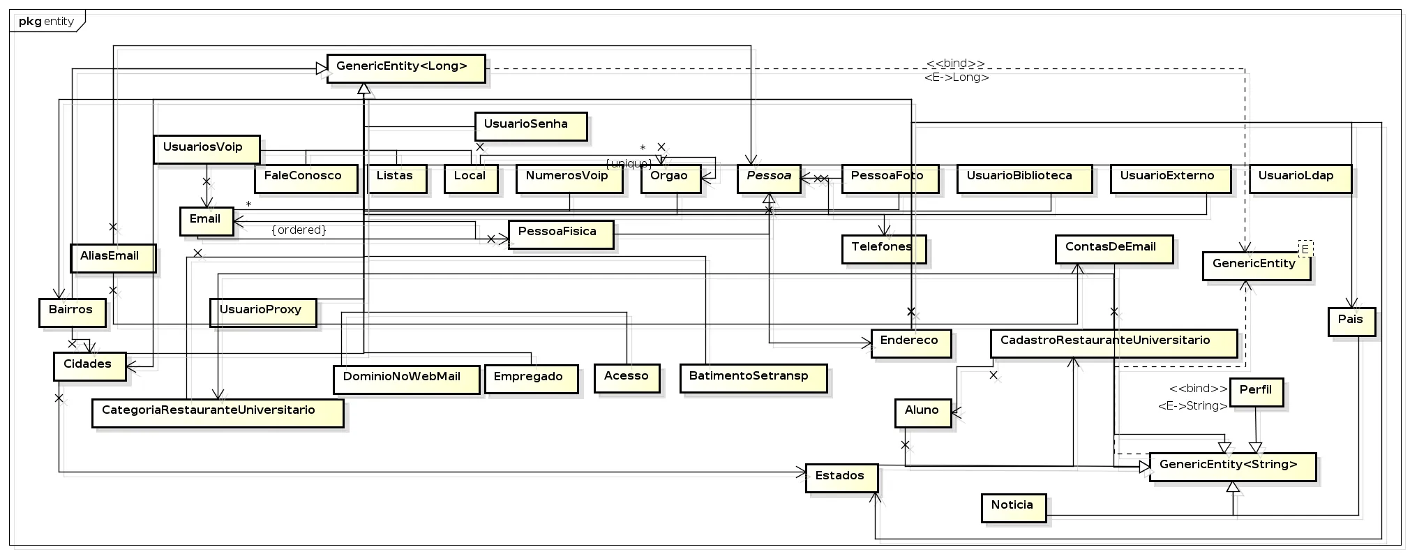 Pode-se perceber que uma grande gama de classes está diretamente ligada a uma superclasse denominada GenericEntity. Isto é uma regra de design (arquitetura/projeto).