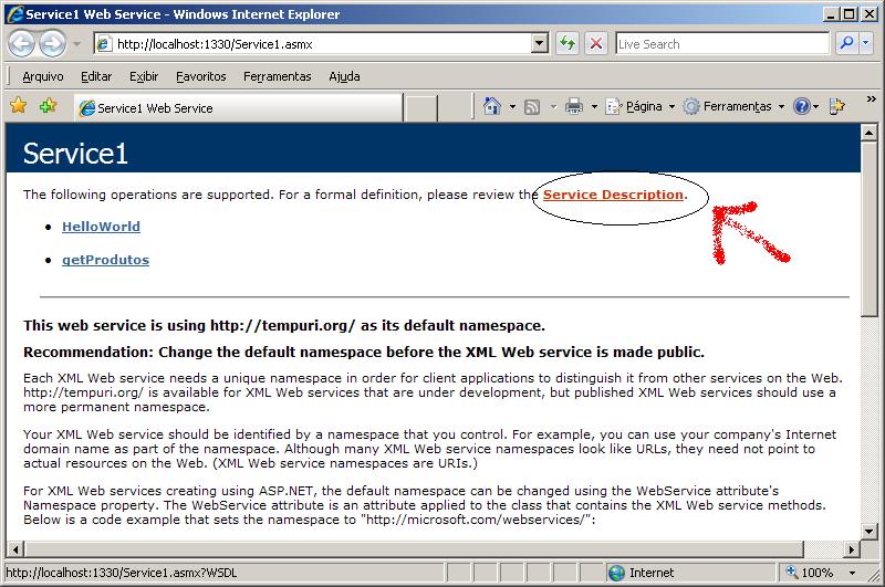 3. Após compilar seu projeto você precisará saber a sua localização lógica por meio do seu WSDL. Para isso execute o seu projeto WS e clique na opção Service Description