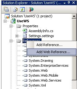 5. Agora temos que adicionar uma webReference ao nosso projeto. Lembre-se que você copiou a url que contém a especificação do seu WS. Então clique com o botão direito do mouse sobre o seu projeto no Solution Explorer e clique na opção Add Web Reference