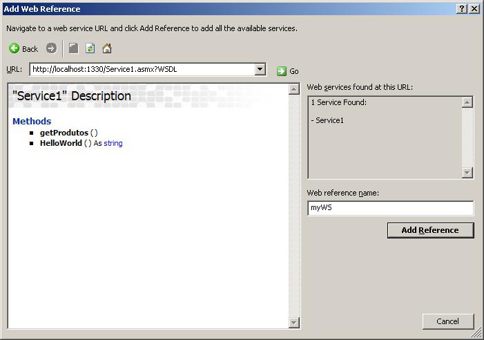 Na janela que aparecerá coloque a url que contém o WSDL do seu WS e clique em Go. A descrição do seu WS aparecerá. Agora vamos mudar o nome da referência a esse objeto na caixa Web reference name para myWS, conforme figura abaixo. Depois clique em Add Reference.