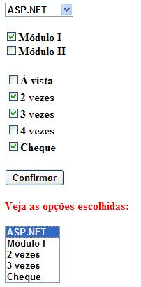 CheckBoxList – Temos também o CheckBoxList que, como o próprio nome sugere, é uma lista em que podemos armazenar diversos checkboxes, por meio da tag ListItem, representada logo abaixo:
