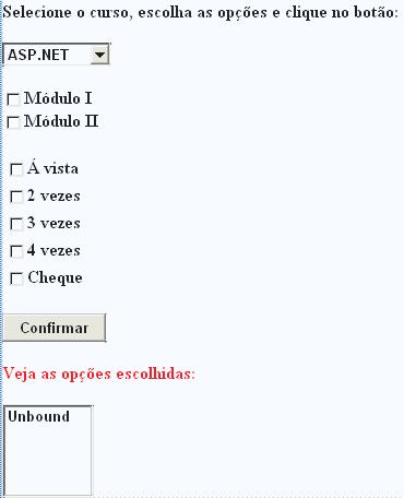 Insira os controles descritos em sua página e também um Button, dando a eles os seguintes ID’s: ddlCursos, chkModulo, chkModulo2, chkFormaPagamento, lstEscolhas e btnConfirmar.
