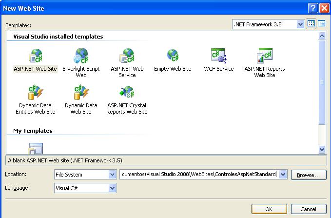 Vá em File > New > WebSite (SHIFT + ALT + N), escolha a linguagem C#, dê o nome de ControlesAspNetStandard e clique em Ok, como mostra a imagem: