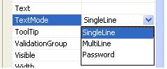 TextBox – O TextBox, que como o próprio nome diz, são as famosas caixas de texto. Podemos usá-las de três modos diferentes: no modo SingleLine, que é o modo padrão, usado para campos de texto comuns, no modo Multiline, usado geralmente em campos de observações, por exemplo, que nos permite digitar uma quantidade maior e mais descritiva. Podemos usar também o modo Password, exemplo de campos de senha. Para alterarmos o modo que o TextBox irá se comportar, é só alterarmos a propriedade TextMode, como a imagem abaixo nos mostra: