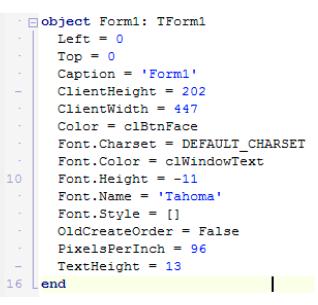 Dentro da declaração de object, são definidas as propriedades do objeto em questão e seus respectivos valores. Todas as alterações que realizamos no object inspector são armazenadas aqui.