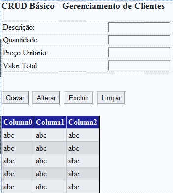Agora em Avaliablefields, adicione um Command Field e altere sua propriedade Show Select Button para True, para depois exibirmos o registro com uma formatação diferente ao clicarmos neste botão. Adicione também quatro campos do tipo Bound Field, que serão os campos exibidos em nosso GridView. Altere as propriedades DataField para, respectivamente: descricao, quantidade, precounitario e valortotal. Faça o mesmo na propriedade Header Text, passando os nomes que foram dados em seus Labels. Após configurar essas opções, clique em OK. Seu GridView deverá ter a seguinte aparência: