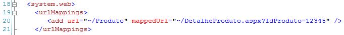 Crie uma aplicação Web, criando duas páginas, dando a elas o nome Produtos.aspx e DetalheProduto.aspx. No arquivo de configuração do site, o Web.Config, adicione a chave do urlMappings, dentro da chave system.web, como ilustra a Listagem 01.