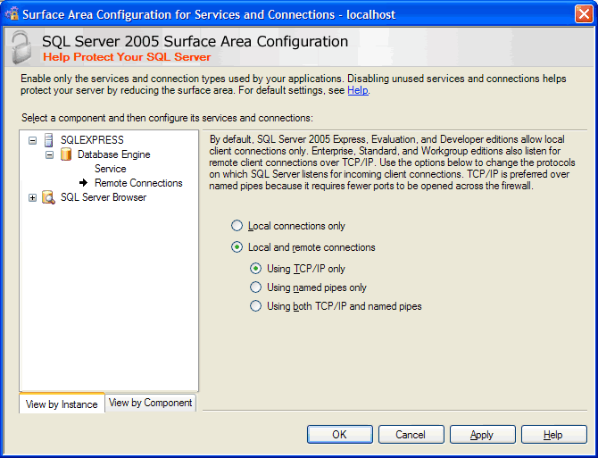 A Microsoft assume como padrão que uma instalação de SQL Server 2005, nas versões EXPRESS, DEVELOPER e EVALUATION, só deve permitir conexões locais, sem o uso do protocolo TCP/IP.