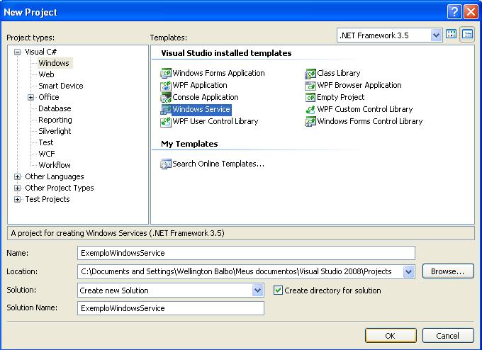 Abra o Visual Studio, vá em File > New Project (CTRL + SHIFT + N), escolha o template Windows Service, dê o nome de ExemploWindowsService e clique em OK.