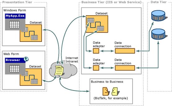 A figura a seguir mostra a arquitetura de uma aplicação distribuída usando ADO.NET. Observe que, por usar XML para intercâmbio de dados, você pode facilmente trocar dados através da Internet. A aplicação cliente pode ser construída usando Windows Forms ou Web Forms: