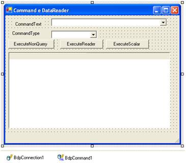 Nossa aplicação vai permitir a configuração das propriedades CommandText e CommandType em tempo de execução. Três botões fazem as chamadas aos métodos do BdpCommand , para deixar mais claro, configurei o Text de cada botão para representar o método que chamam.
