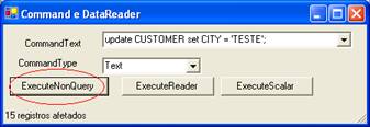 CommandText é a instrução a ser executada, ou o nome da tabela ou Stored Procedure. O método ExecuteNonQuery executa o comando, quando não retornar um resultset (ex. UPDATE,DELETE ou INSERT). Chame ExecuteReader quando o comando retornar um cursor (ex. SELECT), o retorno da função é um DataReader que pode ser utilizado para "varrer" o resultset. ExecuteScalar pode ser usado para retornar apenas o primeiro campo do primeiro registro (ideal para consultas do tipo SELECT MAX, COUNT ...). Continuando o exemplo, vamos ver como utilizar na prática essas propriedades e métodos.