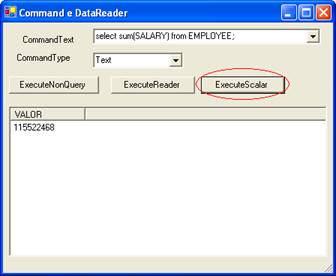 ExecuteScalar pode ser utilizado para retornar apenas o primeiro campo do primeiro registro de uma consulta, o que pode aumentar a performance de consultas que usam funções como SELECT COUNT, MAX, MIN etc. Execute a aplicação e faça os testes conforme mostrado a seguir:
