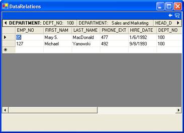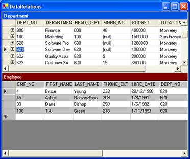 Escolha DEPARTMENT e rode a aplicação. Observe que o DataGrid exibe um sinal “+” para que você possa recuperar os registros do DataTable relacionado: