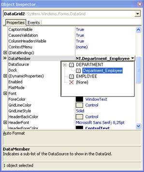 Você também pode querer exibir os dados da tabela mestre e da tabela detalhe ao mesmo tempo na tela. Para isso, coloque um segundo DataGrid e aponte sua propriedade DataSource para DataSet1. Agora o segredo não é apontar o DataMember para o DataTable EMPLOYEE, mas sim para o próprio relacionamento: