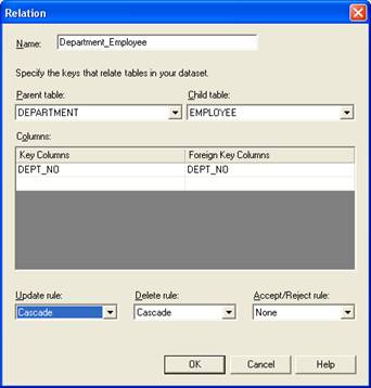 Delete rule indica o que deve ser feito quando um registro na tabela mestre for excluído. Cacade indica que todos os registros relacionados serão apagados. Clique no botão Help para obter mais informações sobre cada um dos tipos disponíveis nessas opções.