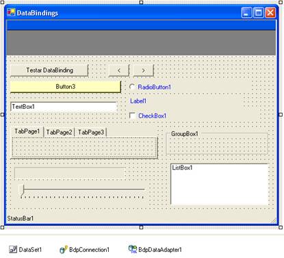 Coloque agora no formulário os seguintes componentes, conforme mostrado no formulário a seguir (os componentes utilizados são: DataGrid, Buttoi, TextBox, TabControl - com três TabPages, ProgressBar, Trackbar, RadioButton, Label, CheckBox, GroupBox, LixtBox e StatusBar):