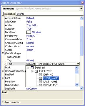 Suponha agora que você queira exibir no TextBox o valor para o campo FIRST_NAME do DataTable EMPLOYEE. Para isso, basta apontar a propriedade DataBindings.Text como mostrado a seguir: