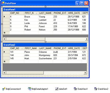 Coloque dois componentes DataView no formulário e aponte a propriedade Table de ambos para DataTable1. Para DataView configure o RowFilter como “EMP_NO < 10” e para o segundo “EMP_NO > 140”. Com isso temos dois DataViews diferentes, cada um com um filtro específico, atuando sobre o mesmo DataTable