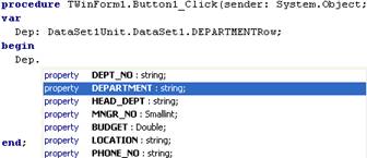 Uma outra vantagem é que você pode tirar vantagem do processo de compilação. Como os campos viram atributos, podemos usar o Code Insight para acessar o nome dos campos. Se usássemos DataSets diretamente, o nome de um campo digitado de forma incorreta só seria detectado em tempo de execução.